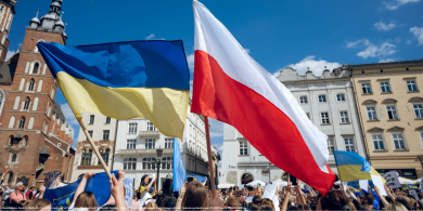 20250221 Ukrainians in Poland Image 01 Posted on February 20, 2025 | Ukrainians in Poland rallying in Kraków, waving Ukrainian and Polish flags. Share Share on Facebook Share on Twitter Share on LinkedIn Share via Email Print
